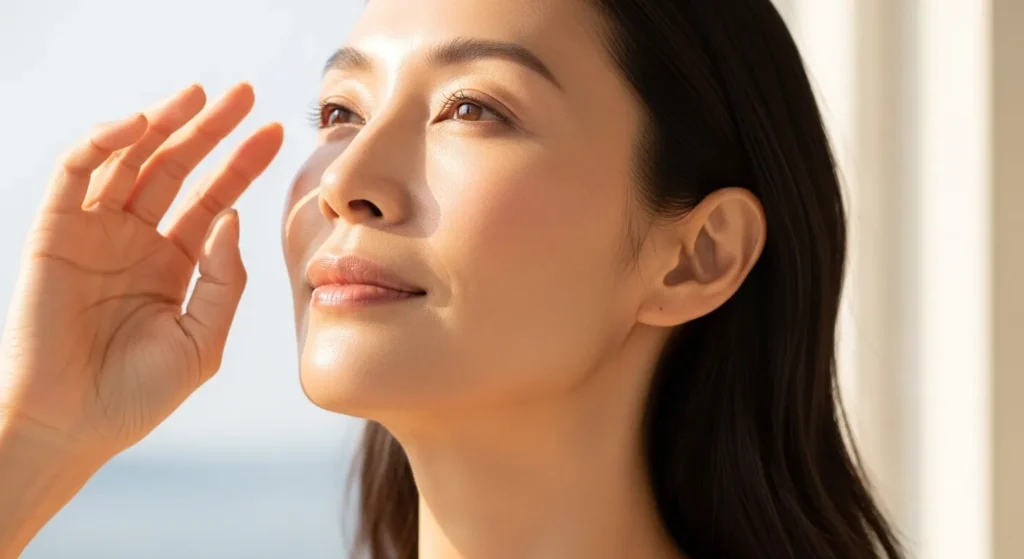 肌の老化は大きく「自然老化」と「光老化」に分けられます。自然老化は加齢に伴い誰にでも起こるものですが、光老化は紫外線の蓄積によって引き起こされる老化。紫外線、とくにUVAは真皮にまで到達し、コラーゲンやエラスチンの変性を引き起こします。日常的に紫外線を浴び続けることで、たるみ・シワ・シミが加速するため、紫外線対策が老け顔予防において欠かせないポイントのひとつです。
