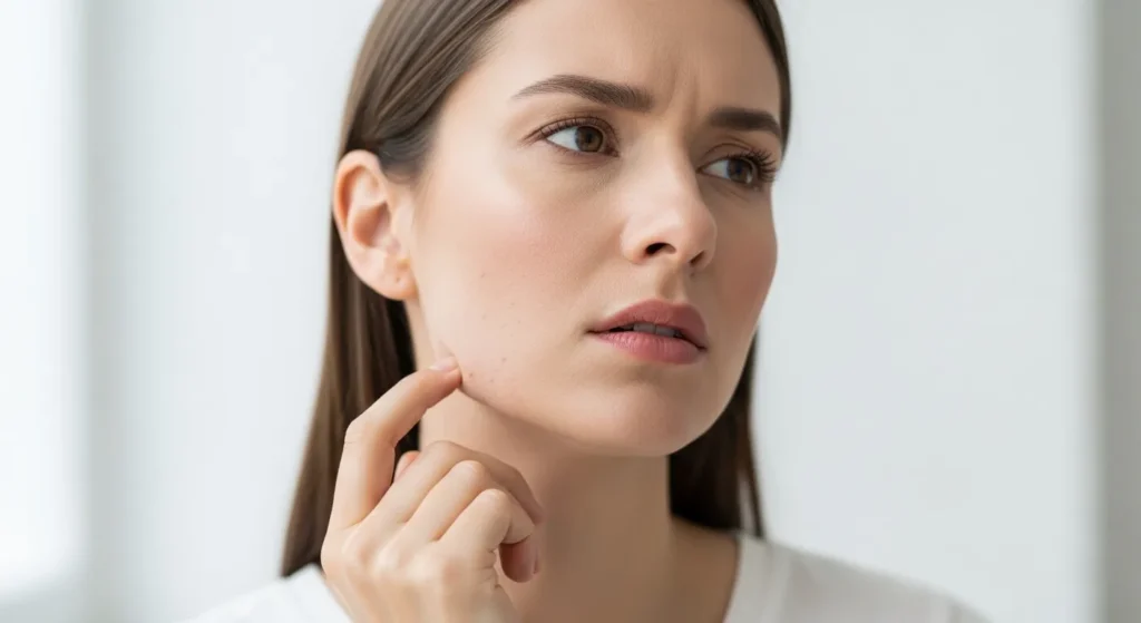 あごの下に硬く赤いしこりのようなニキビができた経験がある方は、まさにこの深い炎症タイプです。膿を持つニキビを無理に潰すと、周囲の組織にダメージが広がり跡が残りやすくなります。触りたくなる気持ちは理解できますが、自己処置は避けて皮膚科で適切な治療を受けることがニキビ跡の予防につながります。